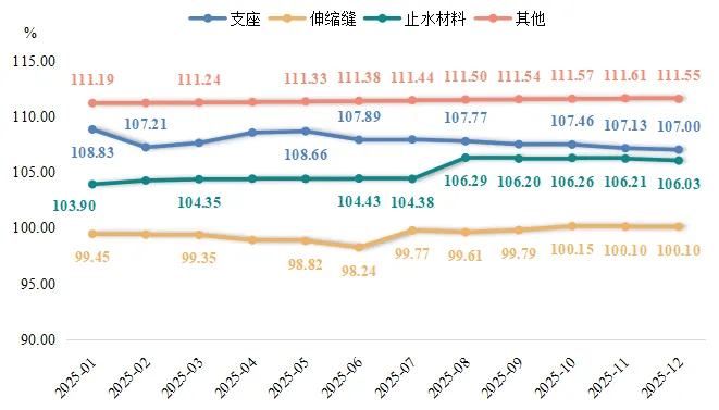 支座类产品价格指数走势较为疲软,2025年呈震荡下滑态势。2月收于上半年低点107.21点,随后逐步回升至5月108.66点;6-12月,支座类产品价格指数连续下行,最终收于107.00点,较年初整体下滑1.83点。从细分品类表现来看,隔震支座2025年行情走势较好,价格指数整体表现上扬;板形支座、球形支座和盆形支座行情表现偏弱,价格指数均有不同程度的下行。
