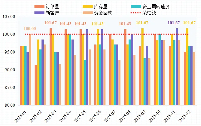 从各月表现来看,4、5月企业经营类景气表现最好,均有三项指标景气指数处于景气区间。其中,4月订单量、库存量和速度景气指数表现良好,指数分别收于101.43点、100.00点和100.00点;5月订单量、库存量仍位于景气区间,分别收于101.43点、100.00点,新客户指数收于101.43点,环比上升2.86点,突破至荣枯线月等月份,企业经营类景气指数均有2项指标位于荣枯线上方运行。其中,订单量景气指数表现相对较好,在多数月份均位于景气区间。