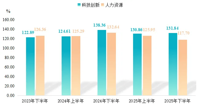 下半年指数收于126.18点,同比下降9.89个百分点。细分指数中,科技创新指数降后回升,人力资源指数则连续回落。